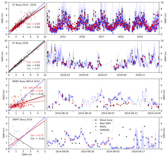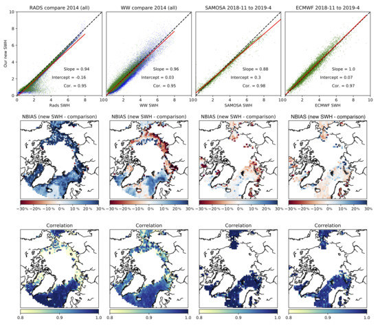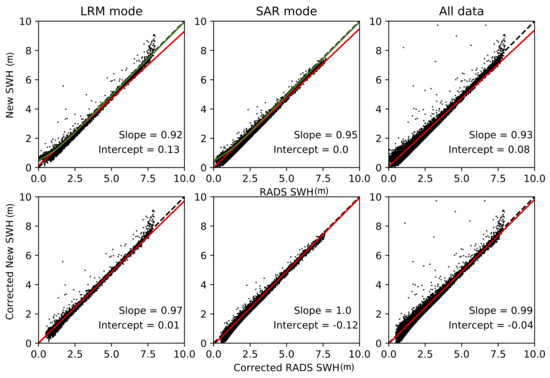 in order to correlate various satellite measurements with a buoy measurement archive. The correction given by Equation (7) is displayed as the green line in Figure 8. Figure 6 shows that our SAR mode SWH is highly correlated with in situ wave buoy measurements, while Figure 7 shows that our new SWH has an emergent bias between LRM and SAR modes which can be used to adjust the SWH retrieved in LRM mode to the corrected by using the slope and intercept in Figure 7. We then compare our adjusted SWH (noting that the new SWH collected in SAR mode remains unchanged) to the corrected RADS data presented by [17] (second row of Figure 8).