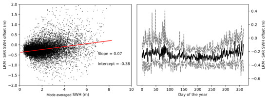 Difference between our retrieved SAR and LRM mode SWH 2011–2019. Plot to the left compares all coincident LRM and SAR mode SWH retrievals vs. the unscaled SWH. The plot to the right is the time series of 25th, 50th and 75th percentile of the LRM to SAR mode SWH offset.
