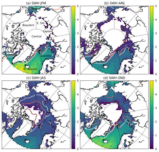 Climatological maps of retirieved SWH (m) for (a) Jan. Feb. Mar., (b) Apr. May. Jun., (c) Jul. Aug. Sep., (d) Oct. Nov. Dec. for the years 2011–2019. Plot (a) indicates the regions used in Figure 10. Overlaid on each plots are the average contours of 15% 50% and 85% sea NSIDC ice concentration for that quarter. Note that the Beaufort region also encompasses the Chukchi and Bering Seas.