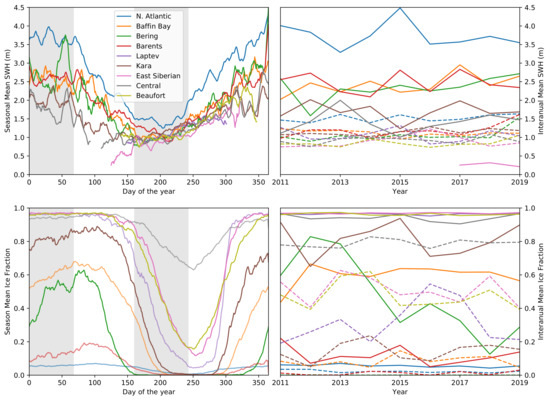 Seasonal cycle (left) and interannual variability (right) of SWH (m) and ice concentration for the regions indicated in Figure 9a. The interanual variability is for the days 01-01 to 03-10 (solid lines) and days 06-10 to 08-30 (dashed lines) periods shown by the grey bands on the seasonal cycle.