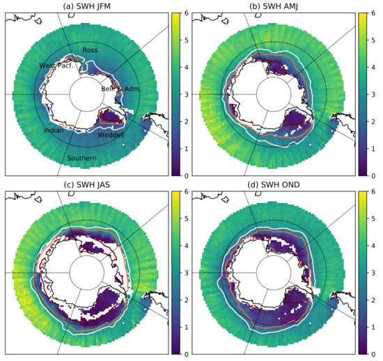 Antarctic climatological maps of retrieved SWH (m) for (a) Jan. Feb. Mar., (b) Apr. May. Jun., (c) Jul. Aug. Sep., (d) Oct. Nov. Dec. for the years 2011–2019. Plot (a) indicates the regions used in Figure S1 (Supplementary Materials). Overlaid on each plots are the contours of 15% 50% and 85% sea NSIDC ice concentration for that quarter. Note that the Weddell, Indian, West Pacific, Ross and Bellingshausen & Admunsen sectors extend only to −60, whilst the Southern Ocean region is over all longitudes.