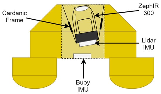 The FDWL was mounted on a proof-of-concept 3 m diameter buoy, designed as a prototype for offshore LiDAR operations. The buoy design was optimized for LiDAR measurements, as well as for tracking wave-induced motion on the device. The LiDAR was placed on a cardanic frame, aimed to keep the instrument still and to reduce the impact of buoy motion. The buoy was equipped with additional sensors, to measure different wind and sea parameters. Specifically, it hosted two MicroStrain 3DM-GX3-45 inertial measurement units (IMU), which combined a high-precision GPS antenna, an accelerometer, and a gyro. The first IMU (i.e., the LiDAR IMU) was located under the LiDAR bottom, and the second IMU (i.e., the buoy IMU) was located on the buoy structure bottom (see Figure 2), being able to measure the buoy and LiDAR attitude. During the campaign, different LiDAR measurement configurations were tested.