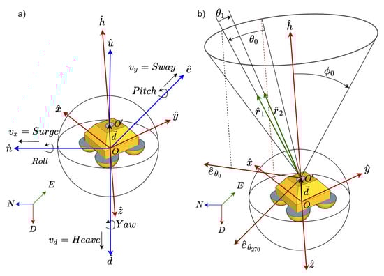 where , , and are surge, sway, and heave motions, respectively, and , and are roll, pitch, and yaw angular velocities, respectively.