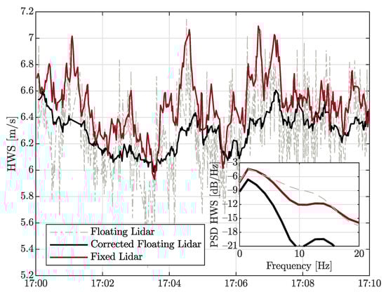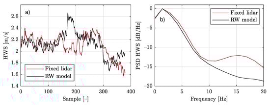 Figure 4 compares the HWS time-series estimated from the RW model (Equation (17)) to that measured by the fixed LiDAR. Figure 4a) demonstrates a similar dynamic range and process variability between both time-series, during most of the time. This is corroborated in Figure 4b), in terms of their associated Power Spectral Densities (PSD). Both PSDs were virtually coincident in the first spectral lobe (10 Hz cut off, −15 dB), indicating that RW modelling is a promising candidate for our estimation purposes. Discrepancies above 10 Hz were responsible for partial time-series tracking around sample nos. 150–200 in Figure 4a).