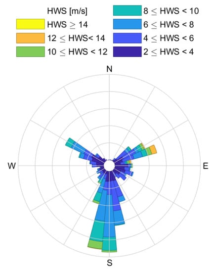 In WE, a standard sampling period of 10 min was used. The mean wind conditions at this resolution were obtained by simply averaging the high-resolution (1 s) wind-vector components into a 10 min period. Thus, the mean HWS was computed as
