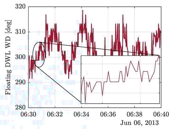 The sign ambiguity in the WD is due to the ZephIR 300 homodyne LiDAR detection, i.e., the LiDAR can only measure unsigned Doppler frequency shifts, which leads to 180-deg ambiguity in the WD retrieved by the VAD algorithm []. This ambiguity is resolved by means of the wind vane installed on the buoy.