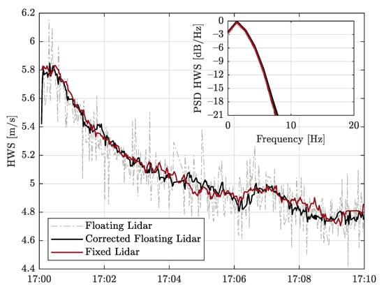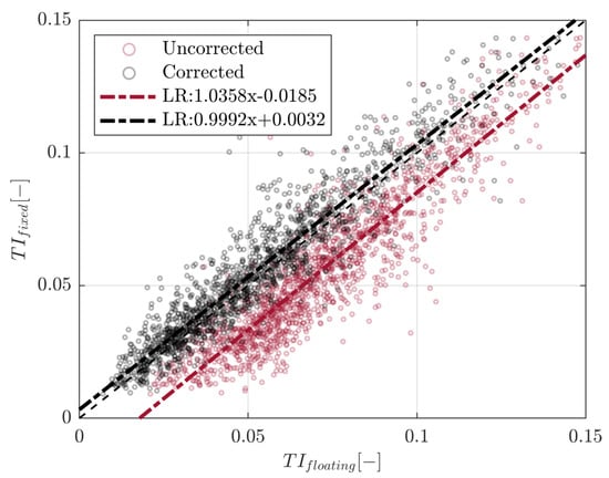 Multiple validation campaigns have shown the robustness and reliability of horizontal wind speed (HWS) and wind direction (WD) FDWL measurements at the ten-minute level [,,,,]. However, FDWLs measure an increased turbulence intensity (TI), in contrast to fixed Doppler Wind LiDARs (DWLs), due to wave-induced motion []. TI is defined as the ratio between the standard deviation of the HWS to the mean HWS. Wave-induced motion adds variance to FDWL HWS measurements, resulting in higher TI [].