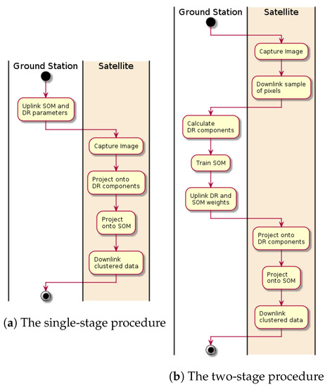 Contextualizing an algorithm within an operational procedure can reveal hidden constraints. Therefore, two operational plans are presented, in which the SOM is used for clustering (Figure 2). In both, the main purpose of clustering is compression. A secondary purpose is to pre-process the image for classification into land, cloud, and water, the output of which can either be sent to autonomous agents for navigational purposes or used in other algorithms, such as georeferencing.