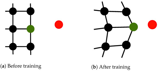 The training proceeds similarly to gradient descent, although, because an objective function for the original SOM has not been found, it is not technically gradient descent [61]. Let denote the index on the SOM of the BMU for input vector from Equation (1). The update step s for each SOM node is given by