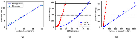 The computational time of the SVM is dominated by the RBF kernel calculation, which is where is the number of support vectors. From the measurements and corresponding interpolated model, the expected computational time is Figure 4c shows the interpolated model for measurements with and bands. The measurements mainly support the linear model; however, there is some deviance for a large number of support vectors. For the ideal requirement of <190 s of computation and a cube with full dimension , the upper limit on the number of support vectors is about 70, which is typically far below the number of support vectors in a model. Reducing the dimension to gives time for about 750 support vectors.