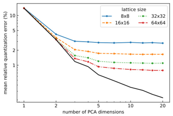 The mean quantization error for four different SOM sizes, for varying numbers of PCA-reduced dimensions. The black line depicts the error imposed by DR itself (prior to applying the SOM), and is thus a lower limit on the error.