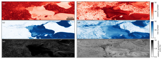 The first North Sea image classified according to the SOM. The (a) column and (b) row of the BMU index. (c) the relative quantization error.