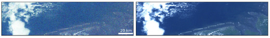 Although these data are initially unlabelled, during this study, one image from the North Sea is labelled as cloud, land, and water. This labelling is imprecise in order to approximate the accuracy of the labelling that will be possible during HYPSO satellite operations, when time is constrained. In other words, amateur operators aided by a map should be able to distinguish the three categories, except perhaps in a few ambiguous cases (e.g., foggy swamp). Each image contains pixels and 86 bands (410–897 nm range, 5.7 nm bandwidth).