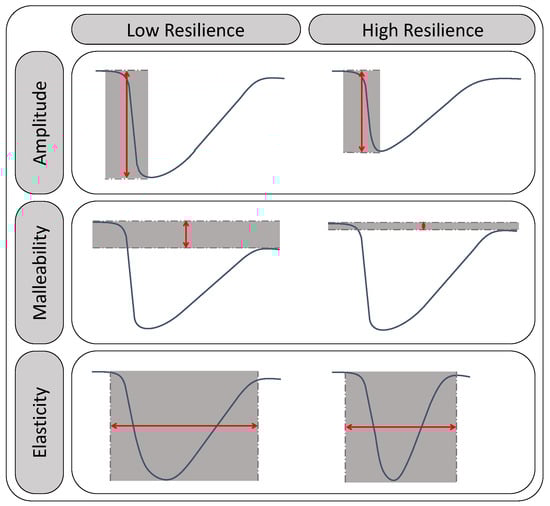 Figure 2 represents the impact of the resilience concepts’ magnitude on the resilience status of the ecosystem. Lower values of amplitude, malleability, and elasticity indicate high ecosystem resilience.
