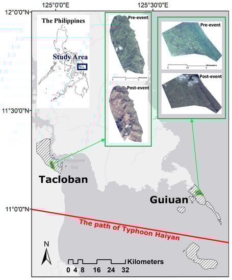 Eastern Visayas in the Philippines consists of two big islands, i.e., Samar and Leyte. Tacloban is the biggest city in this region, which is the capital of Leyte island, has ca. 250,000 population (Figure 5). Guiuan is also located in the Eastern Samar province and has ca. 53,000 population. This region has a tropical climate and rainfall patterns with maximum precipitations from November to January, and it is consistently exposed and experienced wind-born hazardous events (e.g., cyclones) in this time frame. Super Typhoon Haiyan hit both islands including Guiuan and Tacloban regions by its full force on 8 November 2013. Typhoon Haiyan made landfall first in Guiuan and then passed from the southern part of the Tacloban city. In addition, it was followed by coastal flooding with a storm surge up to 5 m and led to a declaration of the state of emergency in those areas. Accordingly, it caused massive damages to urban and rural areas including forests and agriculture.
