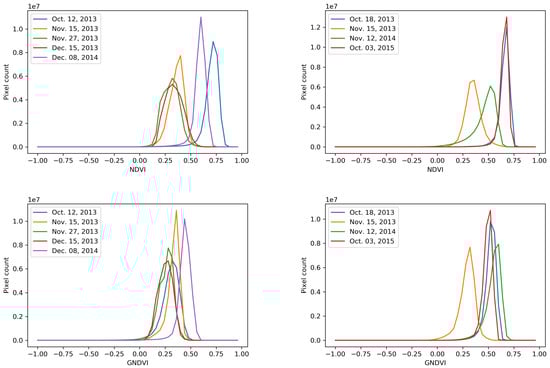 To reduce the sensitivity to background surface and to eliminate the effect of pigments other than chlorophyll, Gitelson et al. (1998) proposed the GNDVI []. They replaced the red band in NDVI with the green band to increase the impact of chlorophyll (Equation (2)). However, some studies show that GNDVI is only sensitive to low chlorophyll contents [].