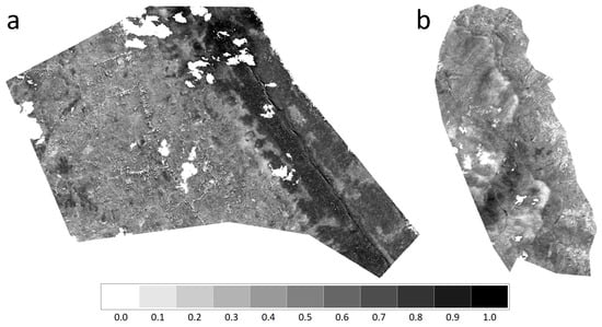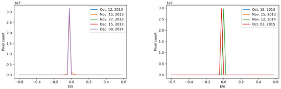To tackle the saturation problem of NDVI in dense biomass areas the EVI was developed by Huete et al. (1997) []. The use of the blue band in the formulation of EVI (Equation (3)) reduces the atmospheric scattering and background soil effects []; however, it is sensitive to albedo []. EVI can be used to calculate the forest canopy health, estimate vegetation LAI, biomass, water content, and the photosynthetic activity of plants [,,].