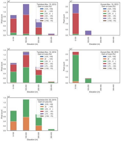 Calculations of biomass gain or loss are conducted considering the elevation of the exposed forest area (Figure 7). The results illustrate that there is a correlation between the damage severity and elevation. The proportion of the higher levels of damage rises by an increase in elevation at both sites (Figure 8). For instance, the first post-typhoon image of the Tacloban site (15 November 2013) indicates biomass loss percentages of 18.7%, 34.4%, 50.4%, and 64.2% at elevation ranges of 0 to 100, 100 to 200, 200 to 300, and 300 to 400 m, respectively. Similarly, severe biomass loss percentage at the Guiuan site rises from 30.5% in areas with elevations below 100 m to 86.1% in areas with elevations between 100 and 200 m.