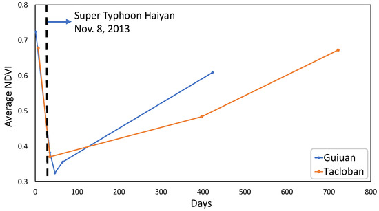 Temporal change in the average NDVI values of the study sites is presented in Figure 13. There is an abrupt reduction in the average NDVI of both areas just after the typhoon. The results reveal that the Guiuan site reached about 80% of its initial (reference) NDVI value one year after the typhoon, while the Tacloban area gained 70% of its initial NDVI value after a year and reached about 99% of the initial NDVI value after two years. Based on our definition of recovery (70% threshold) a single year was enough to recover the biomass at both sites while the Guiuan site has a higher recovery ratio. It should be noted that this is only the gain of the biomass, the distribution of the gained biomass is another important aspect of resilience that the elasticity cannot account for.