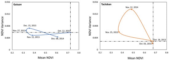 To illustrate the temporal change in biomass distribution patterns (i.e., homogeneous or heterogeneous distribution), a mean-variance analysis is performed. The analysis also indicates any possible change in the state of the ecosystem (Figure 14). The intersection point of horizontal and vertical dashed lines within the plots represents the reference (initial) point. At the reference conditions, the Guiuan site has a higher biomass content and is more heterogeneous than the Tacloban. The higher biomass content improves the resilience of the area, while an increased heterogeneity shows the presence of gaps in the canopy, which is not favored in terms of resilience. Higher human activity in the Guiuan site contributes to the area’s initial heterogeneity. The greenness of both forest areas decreases just after the typhoon; however, the magnitude of the reduction is greater in the Guiuan site than Tacloban, as a result of the multi-hazard disaster. There is a limited change in the variance of the NDVI values in the Guiuan site, while the change in variance is high in the Tacloban. The higher degrees of biomass loss at high elevations of the Tacloban site is the source of such an increase in variance following the typhoon. However, the Tacloban gained considerable biomass until 2014, but the increased variance value indicates the presence of some gaps within the forest, which decrease the resilience by increasing the soil erosion. The placement of Tacloban’s mean-variance NDVI ratio at the upper left quadrant of the plot in 2014 implies the vulnerability of the forest at that time step. Two years after the typhoon the biomass loss is completely compensated and the NDVI variance decreased even further below the initial point. These findings show that two years after the disturbance, not only did the biomass recovered completely, but also the mean-variance plot moved toward the lower right quadrant, which is favorable for a forest ecosystem. However, it did not reach the lower right quadrant till October 2015. In 2014, the Guiuan site regained a big portion of its initial biomass content, and there is not a substantial change in the variance. Considering the intense biomass loss in 2013 and based on 2014 results, the site area is making great progress in terms of biomass recovery.