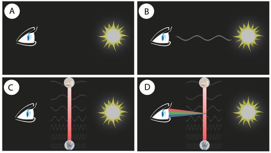 New elements of an animation are added and changed following the voiceover. (A) “To see is to perceive light with our eyes”; (B) “Light is electromagnetic waves”; (C) “Those waves differ in their wavelength, there are long and short waves. The entirety of all electromagnetic wavelengths is called the electromagnetic spectrum. It ranges from very short, e.g., X-rays, up to very long waves, like radio waves”; and (D) “We humans see with our eyes only a small part of this spectrum”.