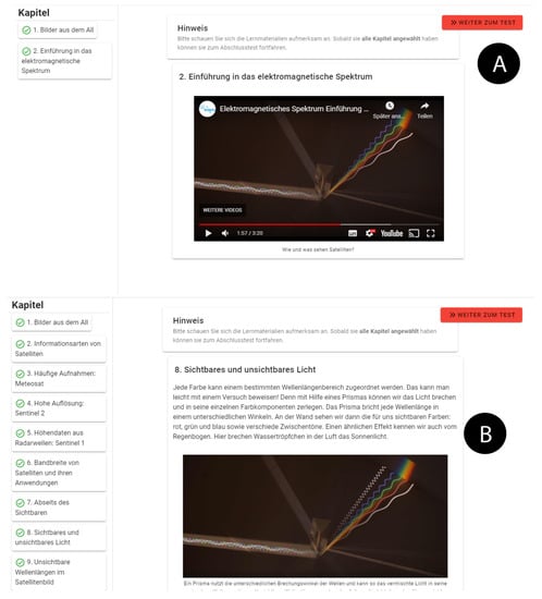 While it is interesting to test whether a learning material is effective at all, it is important to compare different forms of teaching materials to elaborate if a learning effect can be attributed to a specific agent or not. The experimental setup was carried out online due to COVID-19 governmental restrictions. The target groups were pupils of grade 12–13 in German high schools as well as first semester university students of geography that had not yet participated in GIS or remote sensing lessons. The videos used can be accessed via the links in the Supplementary Materials section of this paper.
