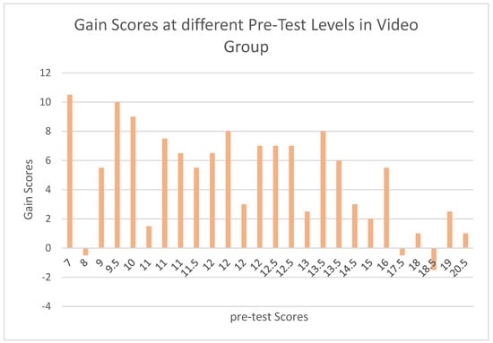 The potential gain that could occur was higher for the group that scored lower on the pre-test—in this case, the video group. A ceiling effect occurs that limits the gain for the group that scored higher on the pre-test. Figure 6 illustrates this by plotting the gain scores of the participants against their respective pre-test scores showing that participants who achieved a low-test score in the pre-test indeed contributed more to the general gain than those who achieved a high pre-test score.