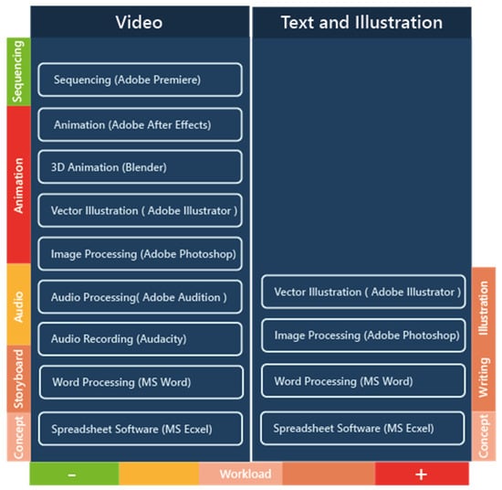 Another important contribution for making learning content effective is the cognitive load theory by Sweller [23] stating that the complexity of a topic can be described as the cognitive load and is the sum of intrinsic load, inherited by the topic itself, and the extrinsic load that is created by the means of teaching. While the intrinsic cognitive load cannot be influenced, keeping the extrinsic load as low as possible is the goal of any teaching material. Both of these research-based approaches influence each step of the production process that will be described here alongside the tools used in each of the steps.