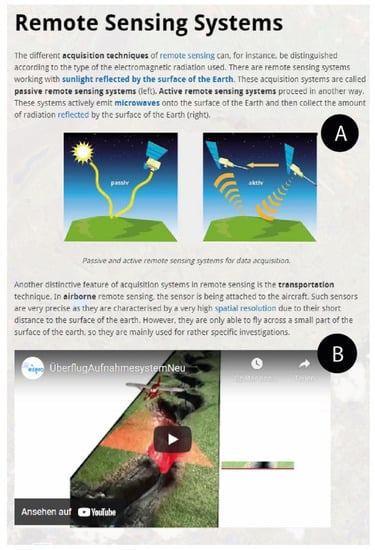 Animations (B) may also be integrated in text alongside illustrations (A). Source: https://www.fis.uni-bonn.de/en/recherchetools/infobox/professionals/remote-sensing-systems, accessed on 18 October 2021).