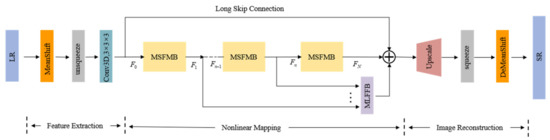 To better protect the integrity of the spectral information and simplify the learning objectives and shortcomings of the spectral features, the network structure of RCAN [44] is used as a reference. The main body of the network adopts the jump connection method for residual learning, among which are several cascaded MSFMBs.