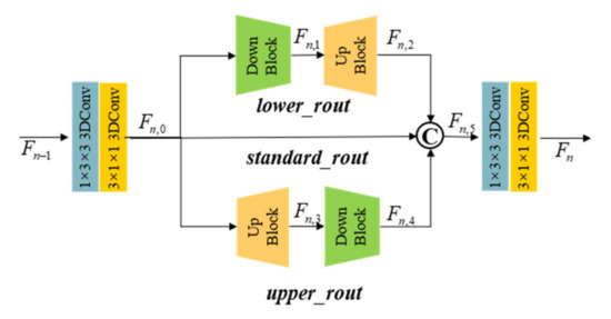 It can be observed from Figure 2 that when performing feature mapping in the MSFMB module, image features are primarily categorized into three paths, namely, lower_rout, standard_rout, and upper_rout. First, the input feature is subjected to the same-scale feature mapping through standard depthwise separable 3D convolution of standard_rout to obtain the Fstd. In the upper_rout, the Fstd is passed through the up-sampling module to obtain the feature , and then the down-sampling module is used to bring it back to the original size, that is, feature . Similarly, in the lower_rout, Fstd is passed through the down-sampling module to obtain the feature , and it is restored to its original size through the up-sampling module to obtain . Eventually, after concatenating the Fstd, Fup, and Fdown and using the standard depthwise separable 3D convolution to achieve feature fusion and channel reduction, the output feature with the channel C is derived. The mathematical representation of the MSFMB module is mentioned below.