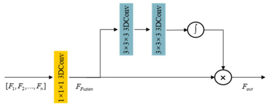 where denotes the discrete wavelet transform, stands for standard 3D convolution with a convolution kernel size of 1 × 1 × 1, I represents the sampling to a sampling operation consistent with the spatial size of the feature F, denotes the sigmoid activation function, and represents the matrix point multiplication. For the down-sampling module, represents a depthwise convolution with a size of 3 × 3 × 3, Group is set to C, and stride is set as 2. For the up-sampling module, represents a depthwise transposed convolution with a size of 3 × 3 × 3, Group is set to C, and stride is set as 2.