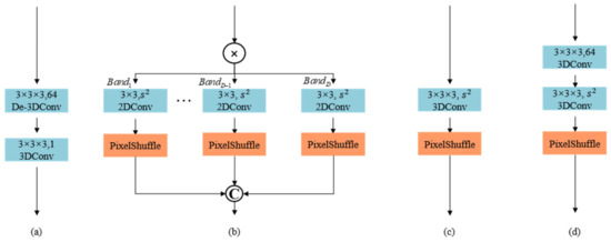 Common image reconstruction modules in the SR method include deconvolution [50] and 2D sub-pixel convolution [51]. Aiming at the problem of multi-band feature reconstruction of remote sensing hyperspectral images, we optimize the sub-pixel convolution, and propose a 3D-based sub-pixel convolution method for the image reconstruction network of MSFMNet. The structure is shown in Figure 5d. Through experiments, we have proved that its effect is better than other structures of Figure 5.