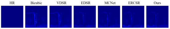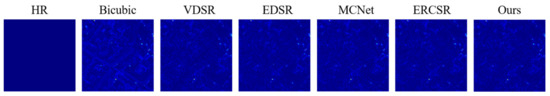 As the error images in Figure 9 shows, for a complex environment with a large number of details, Bicubic could not recover details well, while VDSR, EDSR, ERCSR, and MCNet and ERCSR could only recover details of the part street. The difference between the street details generated by the MSFMNet and the original image was smaller. This proves that MSFMNet has a very good performance in the reconstruction of complex structural information. In terms of spectrum, we select pixels randomly from the image, and plot the reflectance of different bands in Figure 9. It is obvious that the reflectance of the proposed method is the closest to the original image, which demonstrates the superiority of the MSFMNet method in spectrum generation. Due to the normalization of the input and the use of 3D sub-pixel convolution for image reconstruction, our method is more stable in terms of spatial spectral consistency.