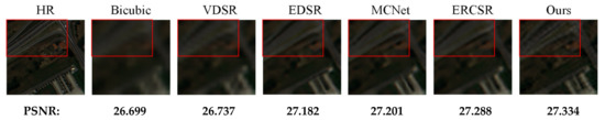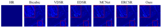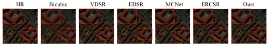 (2) Pavia Dataset: Figure 8 shows the comparison of reconstruction effects of different methods in the Pavia dataset when the scale factor is 4. Among them, the 13th, 35th, and 60th bands are used for color image generation. It can be seen that the Bicubic, EDSR, MCNet, and ERCSR estimates are fuzzy and lack enough details, while the VDSR overfits, resulting in too sharp texture. Only MSFMNet can reconstruct the real details without distortion.