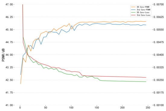 Figure 12 is a line chart showing explaining the convergence process of different convolutions based on the MSFMNet network structure. From the line chart of performance comparison, it can be seen noticed that due to the small parameter amount of the depthwise separable convolution, it has the characteristics of greater depth, based on the depth separability. The convergence effect of the convolutional network model is always better than that of the standard convolutional network model.