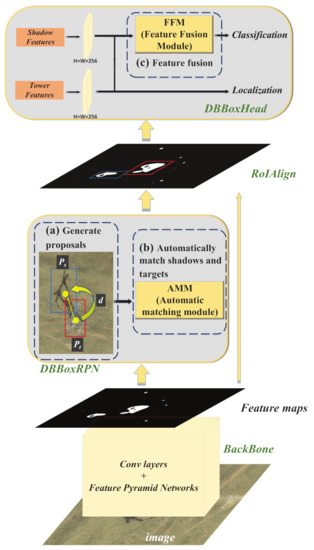 As shown in Figure 4, STC-Det still uses the structure of Faster R-CNN [17], but it improved the region proposal network (RPN) and Head in Faster R-CNN, and named them DBBoxRPN and DBBoxHead, respectively. In DBBoxRPN, the candidate regions of the shadow and the target are extracted separately, and the automatic matching module (AMM) module is used to realize the automatic matching of the shadow with the target. In DBBoxHead, the FFM module is used to realize the information fusion and automatic weighting of shadow features and target features, which solves the problem of information fusion.