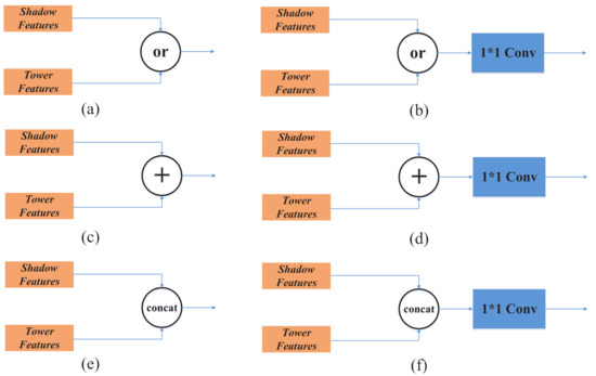 Figure 6 shows six feature fusion methods, of which (a) and (b) use only one feature of the shadow and the target, (c) and (d) directly add the shadow and the target feature together, and (e) and (f) combine the features of the shadows and the target. The three fusion methods on the left in Figure 6 do not use 1*1 convolution after fusion, while the three methods on the right use 1*1 convolution after fusion. 1*1 convolution is a point-by-point channel convolution, where it acts as a weighted average and can dynamically learn weighting coefficients.
