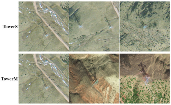 The data used in the experiment includes three types of transmission towers with heights between 15 m and 70 m, namely the wine-glass tower, the dry-type tower and cat-head tower, the same as SI-STD [22]. In order to verify the effectiveness of the methods proposed in this paper, we made two data sets. To make it easier to distinguish, we named the first data set “TowerS” and the second data set “TowerM”, as shown in Figure 7. The satellite perspective of TowerS is relatively small, and the satellite perspective of TowerM is variable. Both of these data sets are intercepted from BJ-2, WV-2 and Google Earth, and the size of a single data is 600*600. TowerS contains 1574 training data and 686 test data, while TowerM contains 2575 training data and 904 test data. The data volume of the three towers in all data sets is approximately 1:1:1.