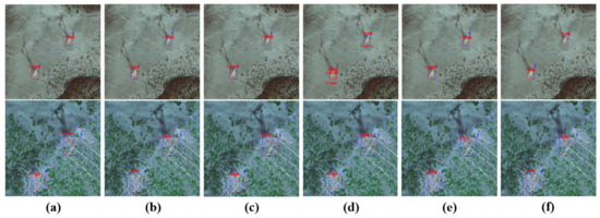Visualization results of six types of networks on the two data sets. (a) is the partial result of Faster R-CNN, (b) is the partial result of TSD, (c) is the partial result of ATSS, (d) is the partial result of Retinanet, (e) is the partial result of result SI-STD, and (f) shows part of the results of STC-Det. The upper row in the figure is a partial result on the TowerS data set, and the next row is a partial result on the TowerM data set. The red rectangles in the figure are the prediction results of the networks, and the blue rectangles are the ground truths.