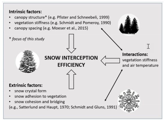 Despite its importance as a variable in hydrological models [2,9,10], accurately estimating snow interception remains challenging due to complex interactions between intrinsic and extrinsic factors (Figure 1). Intrinsic structural factors like branch/canopy arrangement and vegetation stiffness and their effect on snow storage dynamics have been studied at the branch level with physical models [11,12], excised branches [13], and time-lapse video [14]. These studies described how branch architecture influences micro-scale (sub-centimeter) mechanisms that control how and where snow accumulates, as well as the rate of accumulation. For example, Pfister and Schneebeli [12] found that snow interception efficiency increased with the width of the branch due to reduced snow crystal rebound near the edges, and irregularly shaped branch models with low inclination angles had significantly higher accumulations. Schmidt and Gluns [13] observed how differences in branch structure between conifer species affect mechanisms of snow interception efficiency (e.g., crystal rebound, snow bridging), although meteorological conditions produced greater differences in snow interception. Indeed, snow interception is also partially controlled by extrinsic hydrometeorological factors (e.g., air temperature, snow water content, wind speed, etc.) that affect crystal type, snow adhesion to vegetation, and bridging of snow due to cohesion [15]. Furthermore, the interaction between extrinsic air temperature and intrinsic branch flexibility affects snow interception efficiency through the process of mass unloading [16].