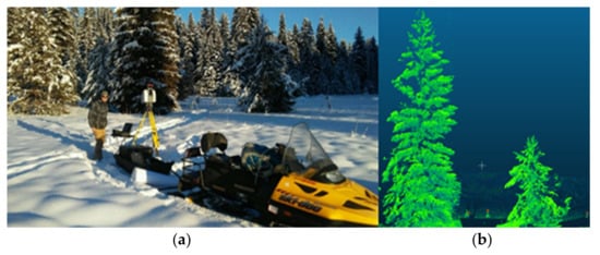 (a) Photo of the lead author conducting terrestrial laser scanning (TLS) at Bear Basin on December 5, 2018; (b) raw TLS point cloud data of two trees.