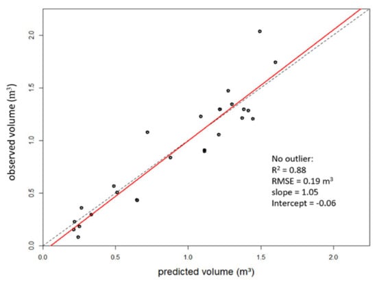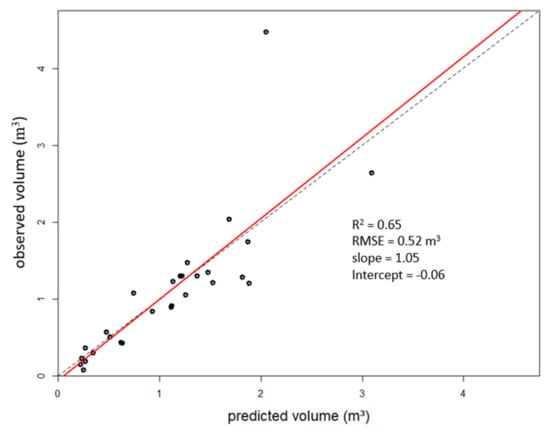 Predicted versus observed volume (m3) for the final random forest model with no outlier included. Dashed black line is the 1:1 line; solid red line is the regression line.