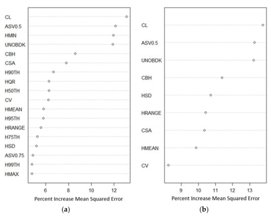 Plots of variable importance with and without the inclusion of height percentile metrics (Figure 5) indicate that crown length (CL) is consistently the most important variable. The five most important variables for the final model (Figure 5b) are ranked (from most to least important) as follows: CL, ASV0.5, UNOBDK, CBH, and HSD.