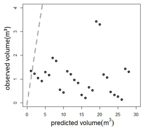 Predicted versus observed volume (m3) for the general mixed-effects model using LAI as the only predictor (marginal R2 = 0.01). Dashed grey line is the 1:1 line.