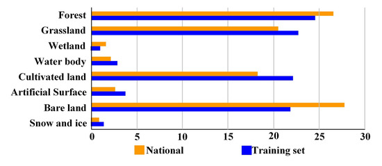 To train a network that could be used in national-land cover mapping, for both 2005 and 2010, 19200 non-overlapping training samples were manually selected, each with a size of pixels as shown in Table 2. The two training sets from typical regions and the whole nation were composed of two time periods, namely, 2005 and 2010. Time series training samples were employed to increase the generality of the proposed MTNet in this study, due to the similarity between their image features and the difference of the corresponding information. Since we wanted to train a network that would be used to produce a national land-cover map of China, the selected training samples were distributed across the whole nation. More training samples were taken from regions where more features were presented, such as eastern coastal areas; fewer training samples were acquired from regions containing fewer features, such as the large areas of grassland and desert with China. It is well known that the learning ability of the DL network is better when the training samples are balanced. If a DL-based network is used with an unbalanced training set, the accuracy of the classes that occupies a small proportion tends to be sacrificed to ensure the overall accuracy. However, the distribution of classes across China as a whole is naturally unbalanced. Considering the influence of different proportions of each class, the proportion of the less distributed classes are increased to match the proportion of majority classes to balance the training set as much as possible. The proportions of different classes for the whole of China and in the training set are shown in Figure 4. Less-distributed classes such as water bodies, artificial surfaces and snow and ice clearly had greater proportions in the training set than their actual proportions within China; for wetland, the opposite was the case. The reason for this is that the areas of wetland were very dispersed, and this made it difficult to collect training samples for this class. Even if a greater effort had been made to achieve a better balance between the class proportions, the variation would still have been large.