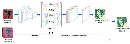 Flowchart of MTNet. Training set of Time 1 was used to train the PSPNet. Then, the trained network was finetuned by the training set of Time 2 to make the network suitable for land cover mapping of images in Time 2.