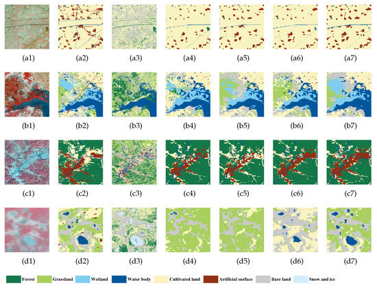 Detailed classification results for Hubei, where (a1–d1) are the original Landsat images, (a2–d2) are the reference, (a3–d3) are classification results for RF classifier, (a4–d4) are classification results of PSPNet-RL, (a5–d5) are classification results of PSPNet, (a6–d6) are classification results of PSPNet-TF, and (a7–d7) are classification results of MTNet. The results shown in (a1–b7) are for the year 2005; the results shown in (c1–d7) are for 2010.
