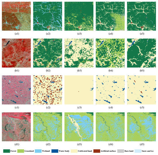 Detailed classification results for the original Landsat images and corresponding land cover maps, where (a1–d1) are original Landsat images, which were used for the producing of GLC30 and the results of PSPNet and MTNet; (a2–d2) are classification results from the Land Cover Map of People’s Republic of China; (a3–d3) are classification results from the GLC30; (a4–d4) are classification results of PSPNet and (a5–d5) are classification results of MTNet.