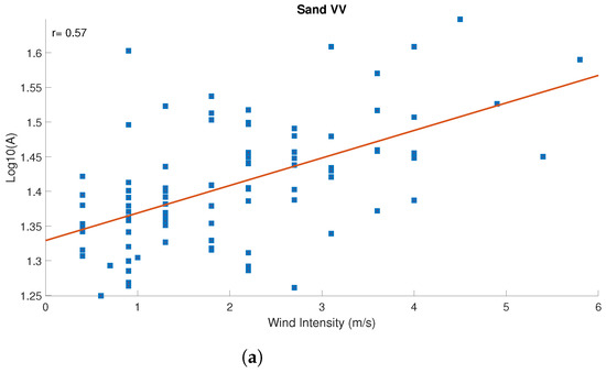 The correlation factor between the amplitude and the wind intensity has been evaluated for both polarizations and for all the masks. The highest correlation occurs obviously in the sea mask for both polarizations, with a correlation factor for VH and for VV. Polarizations VV and VH also show a significant correlation on the sand area, where the correlation factors are and respectively, see Figure 10a,b.